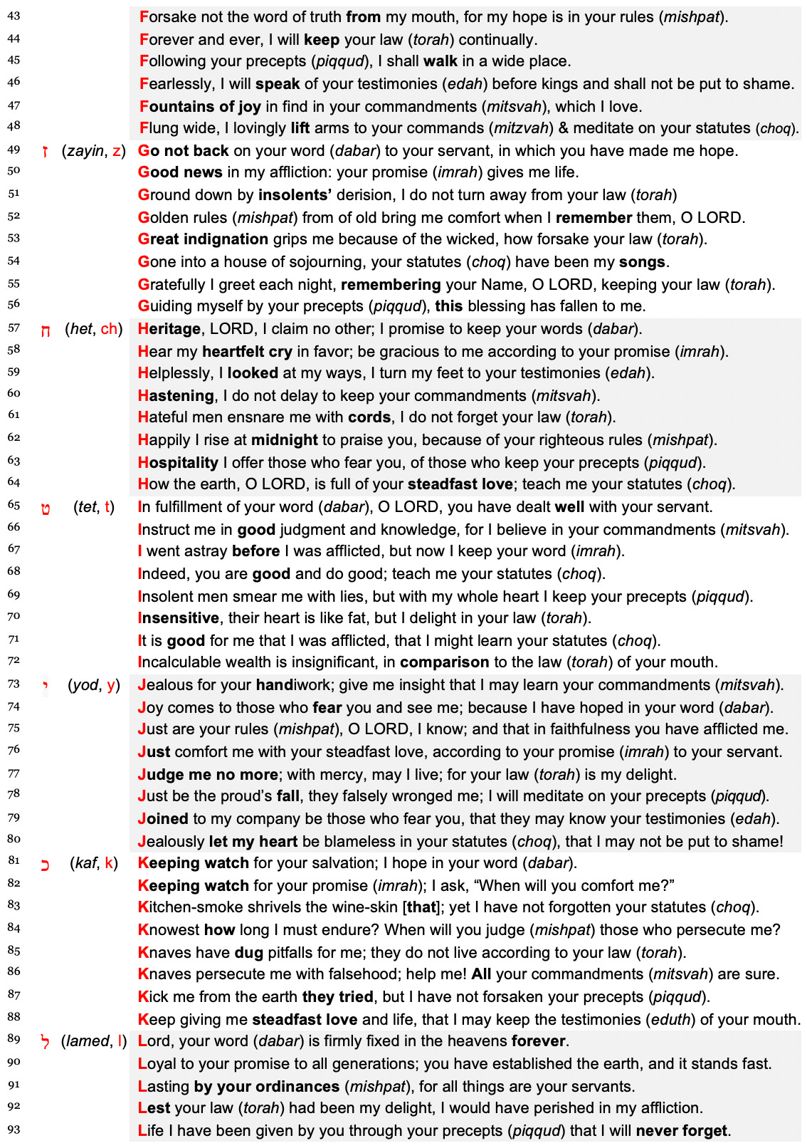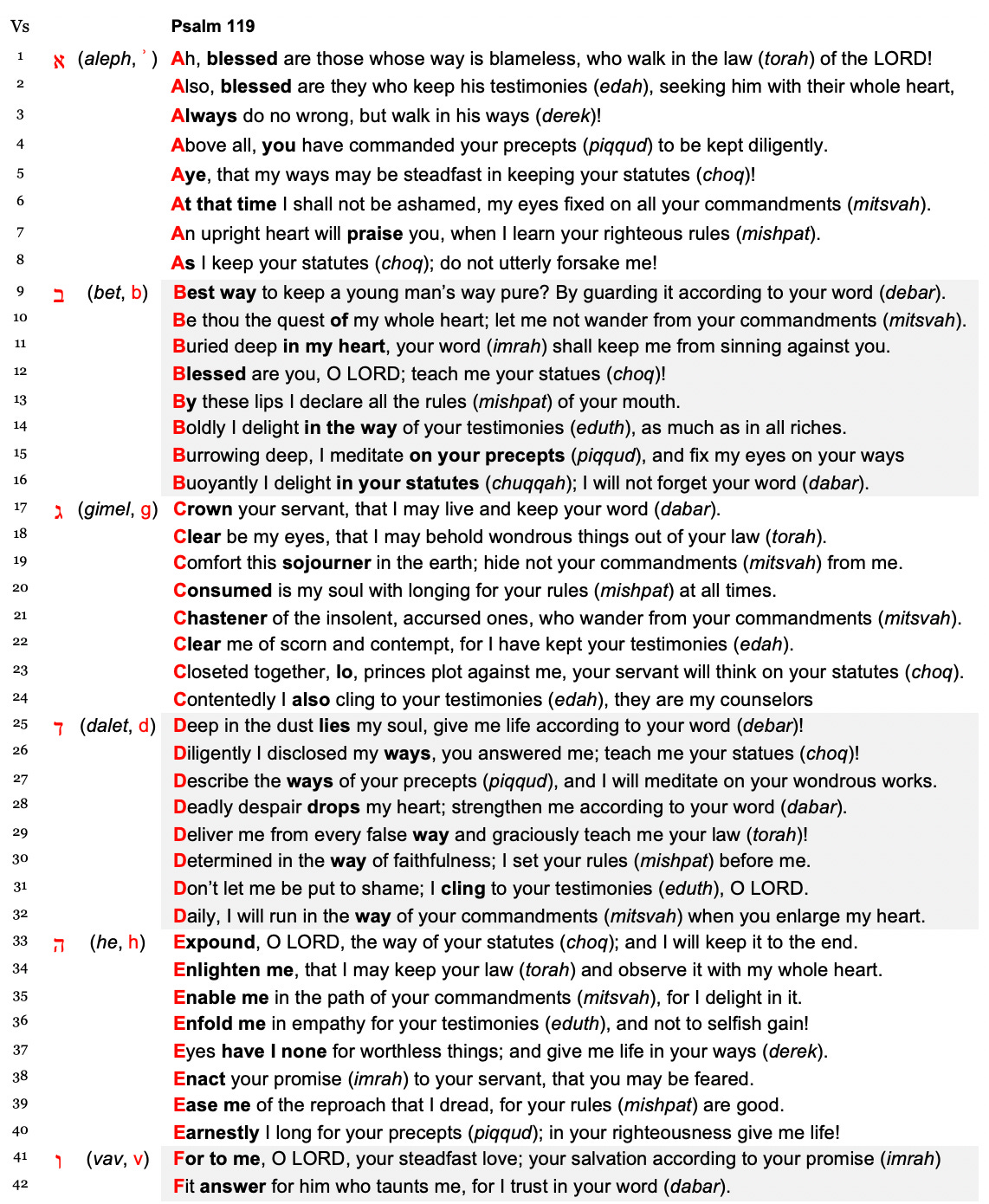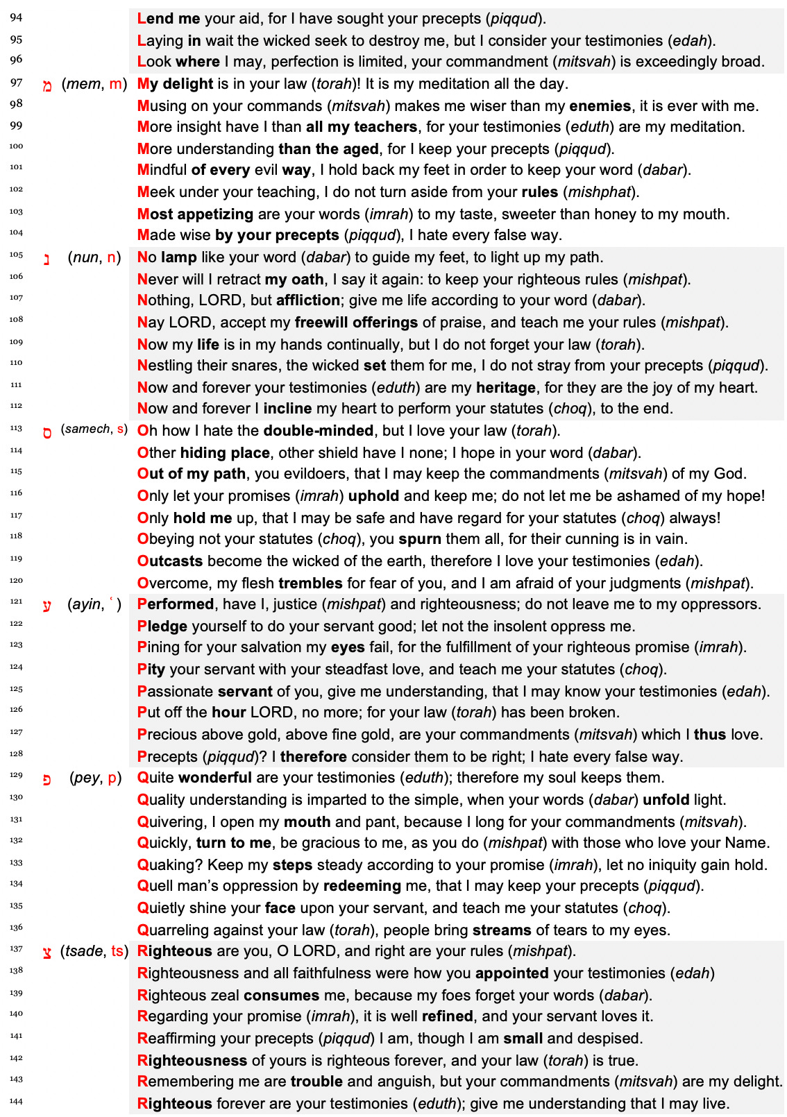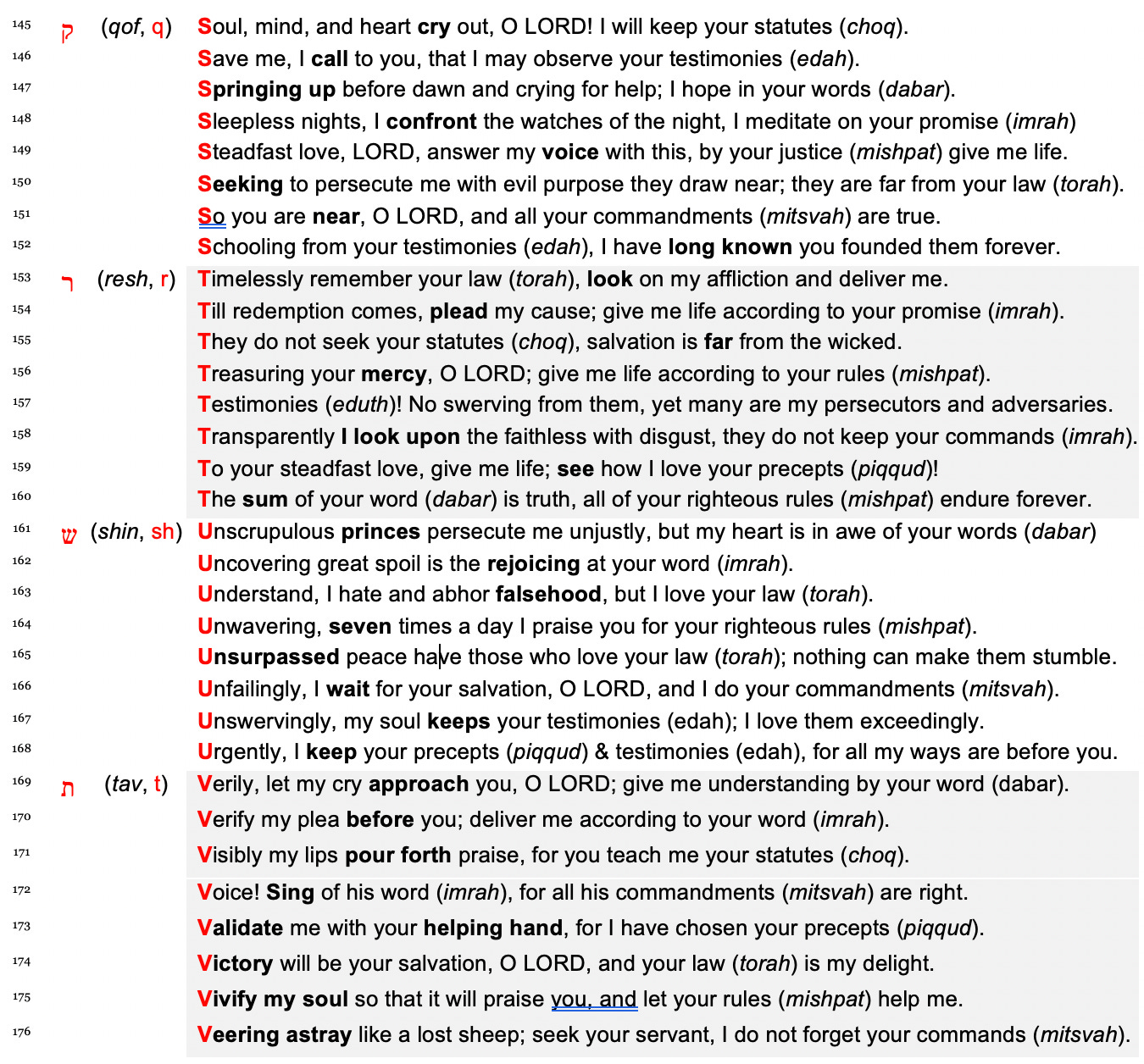 Of these, the most sprawling and best-known is Psalm 119, which expands on the previous psalm’s “Blessed is he who comes in the name of the Lord.” It has a set of eight stanzas for each letter. A few years back, Douglas van Dorn offered this translation: