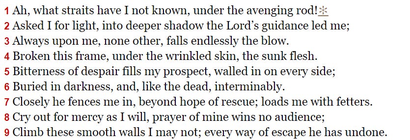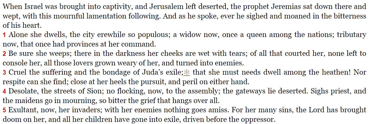 The Biblical books that contain acrostics all have pretty self-descriptive titles. Psalms is mostly songs of joy, Proverbs words of wisdom. The Book of Lamentations, like much of The Babylonian Theodicy, is a darker, more depressing work. As with our other examples, the Knox Bible renders its acrostics in acrostic form: