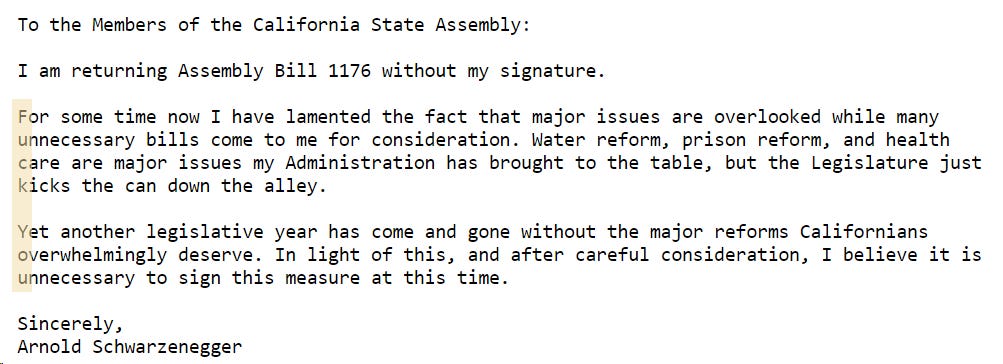 In modern times, acrostics are often used to conceal a message of protest or spite from the intended recipient, leaving it hidden for more agile minds to discover. One such message was in a notorious veto Arnold Schwarzenegger wrote as governor in 2009 (I’ve highlighted the relevant letters for clarity):
