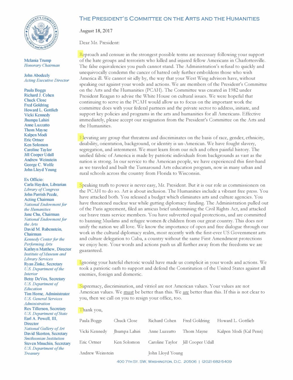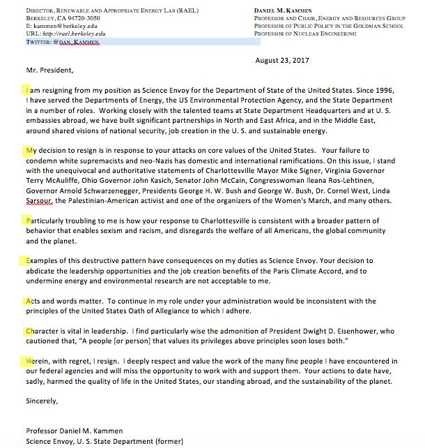 Similar messages appeared in two resignation letters aimed at the Trump administration, within the same week of August 2017, in response to Trump’s response to the violent Charlottesville rally. These acrostics were paragraph-based, not line-based, and therefore a bit more subtle, though the press picked up on them in no time at all. Again, highlights are mine:
