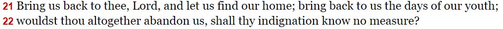 That just leaves Lamentations 5, twenty-two lines long—which suggests an acrostic—but in a totally non-acrostic structure, as if the chaos of Israel’s current existence has now wrecked even the poetic form used to express it. (I’ll stick to Knox in the quotes below, just for comparison’s sake.)