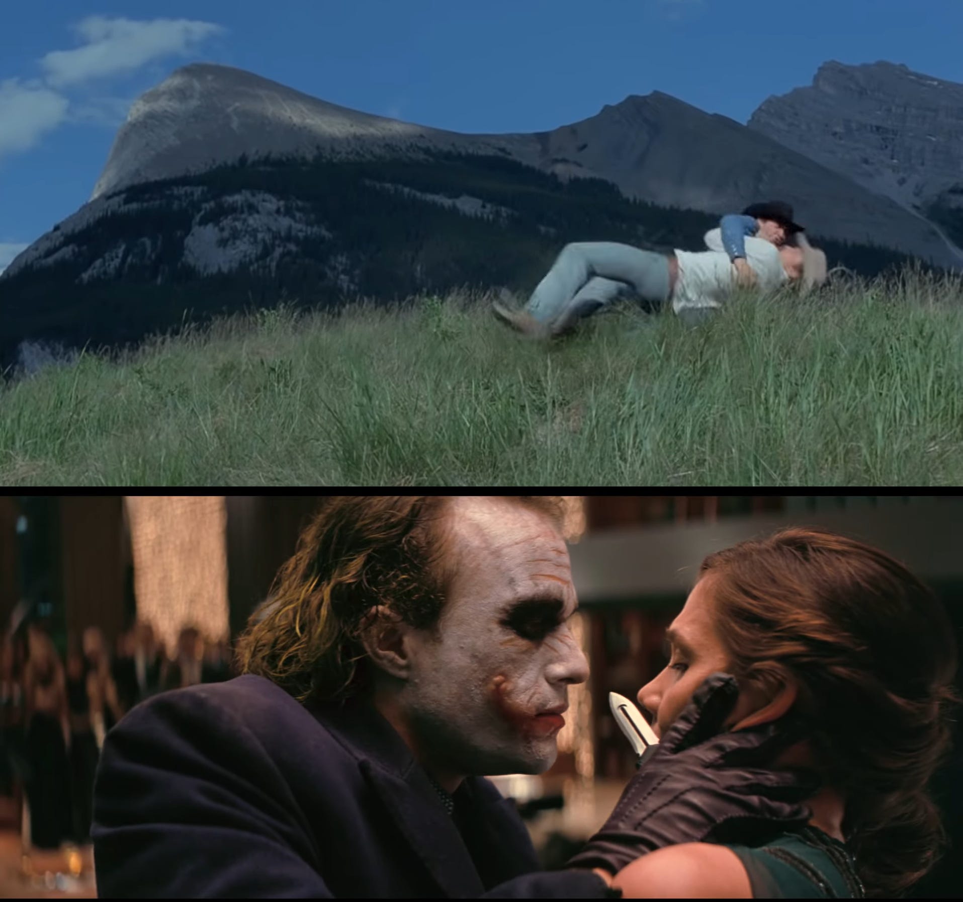 Finally, “Ledger and Gyllenhaal” refers to two different pairings: Ledger and Jake Gyllenhaal’s Ennis and Jack in Brokeback Mountain, and Ledger’s Joker menacing Maggie Gyllenhaal’s Rachel Dawes in Dark Knight. My original idea there was “Ledger wrestles Gyllenhaal,” due to the moments below…