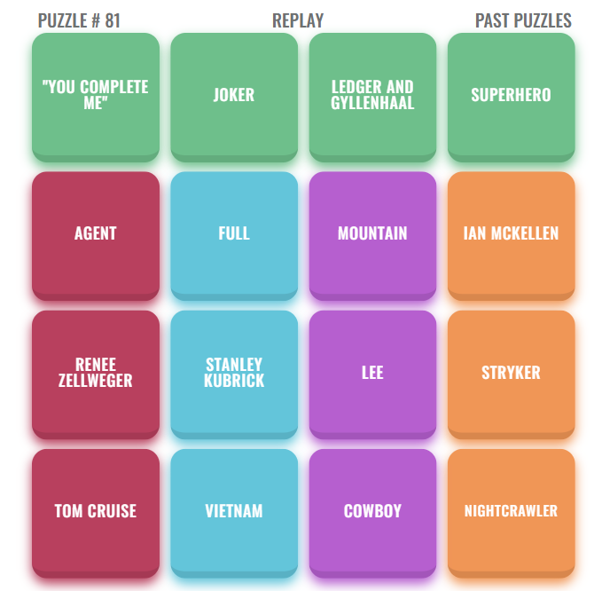 Here’s the first Cine2Nerdle design I contributed. It features The Dark Knight (across), and Jerry Maguire, Full Metal Jacket, X2, and Brokeback Mountain (down)…