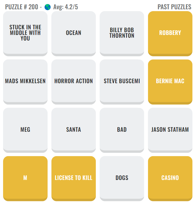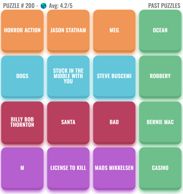 Tiles can represent many different aspects of a film, including actors (five tiles here), title words (Bad, Santa, Dogs, Meg, Ocean) character names (M, Ocean), soundtrack music (“Stuck in the Middle with You”) plot details (license to kill, robbery), genre (horror action), and setting (casino, ocean). Other puzzles have included directors, composers, quotations—any short item you might associate with a movie.