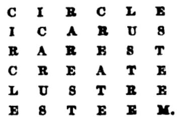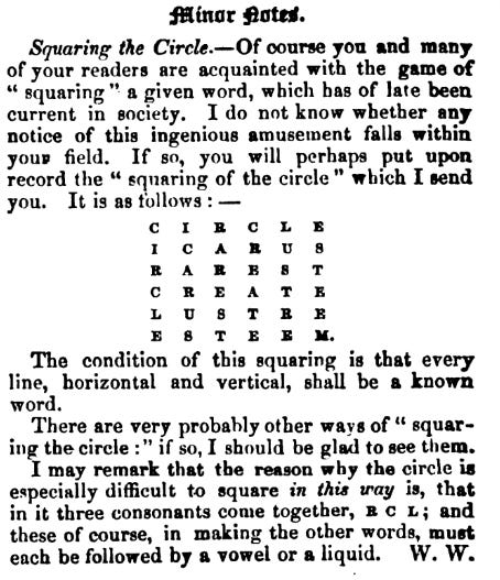 In the nineteenth century, English word squares grew common, though most tended to be small. The first that was six letters by six letters appeared on July 2, 1859, in the British magazine Notes & Queries, and is shown below in its original format, followed by a larger version for clarity.