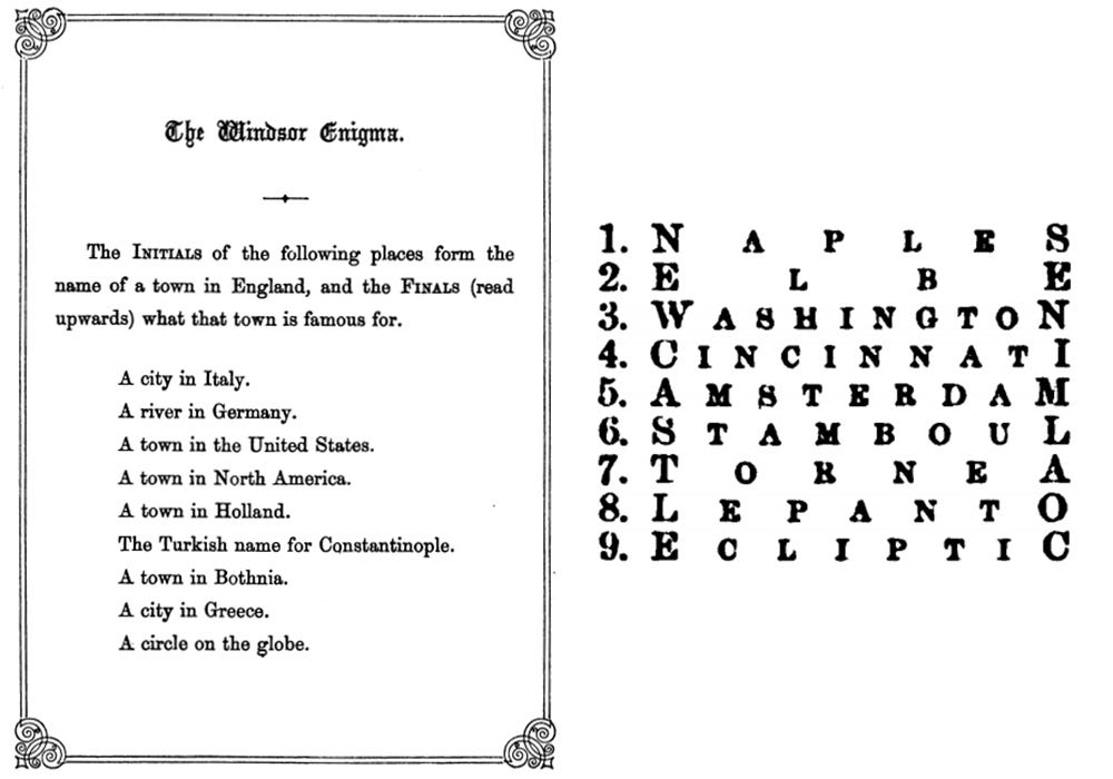 Next to nothing is known about Frederick Planche, either. But Planche’s Guess Me, from 1872, contains the earliest examples I can find of a fill-it-in-yourself, cross-these-words puzzle. The answers are classic word squares, reading the same across and down, but you the reader are invited to fill them in: