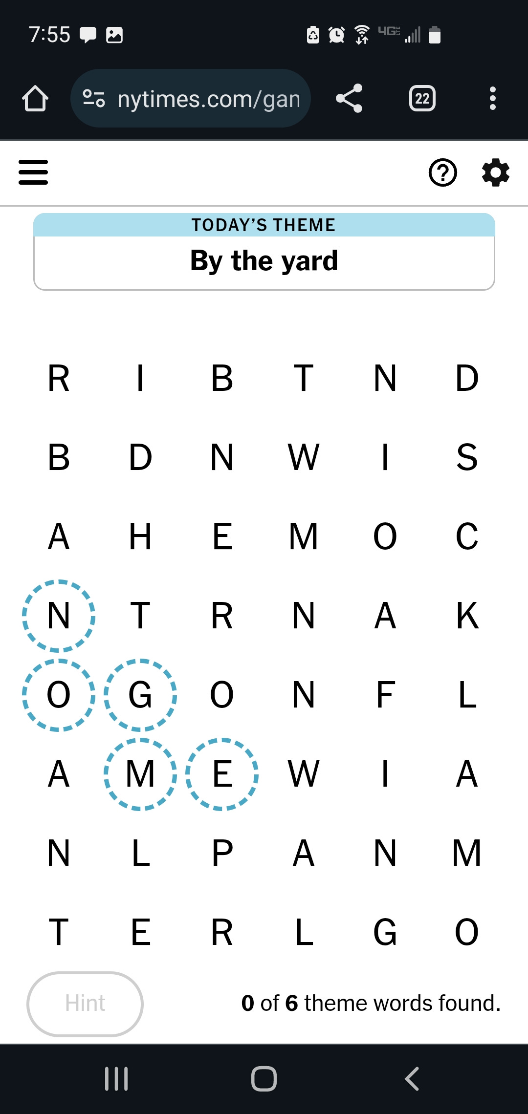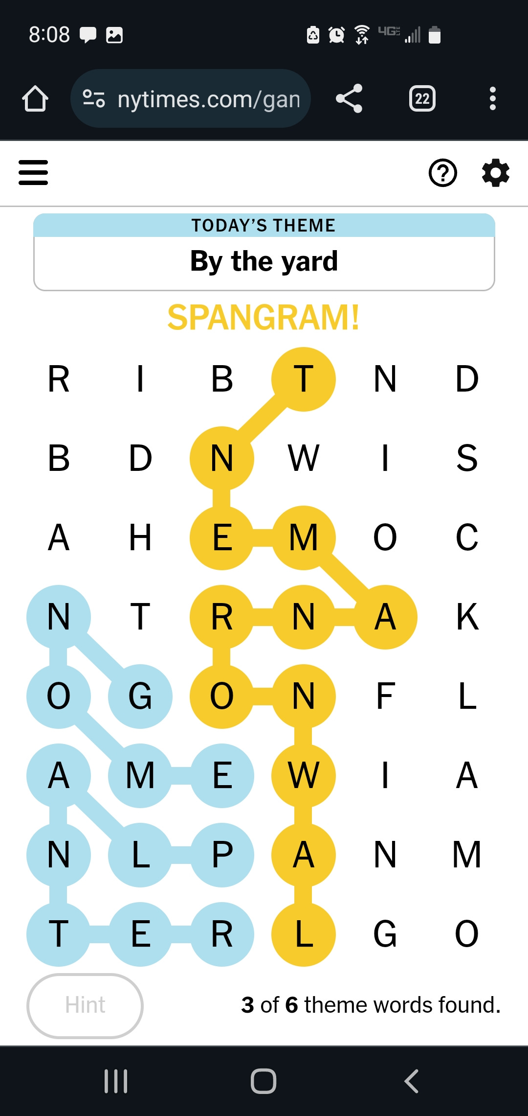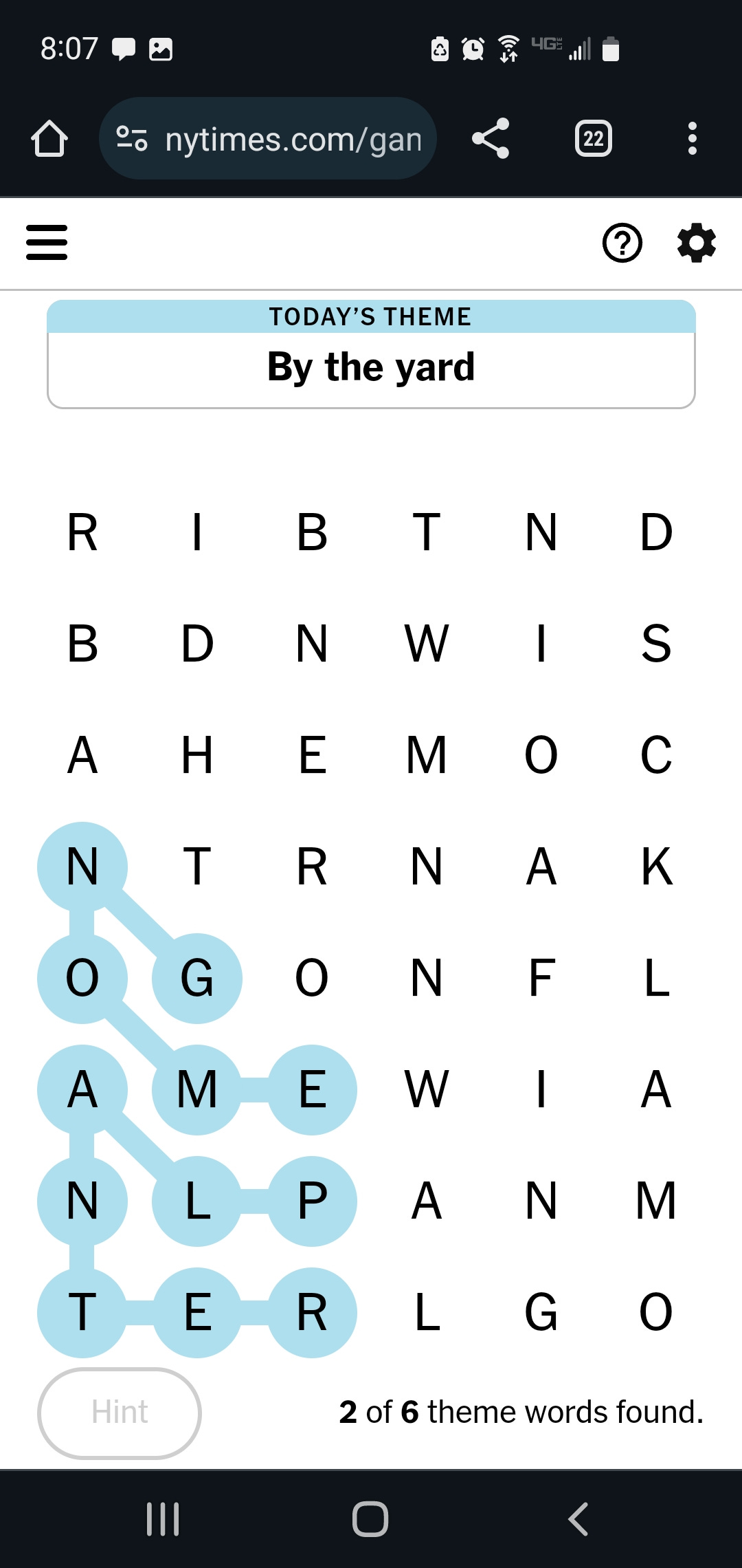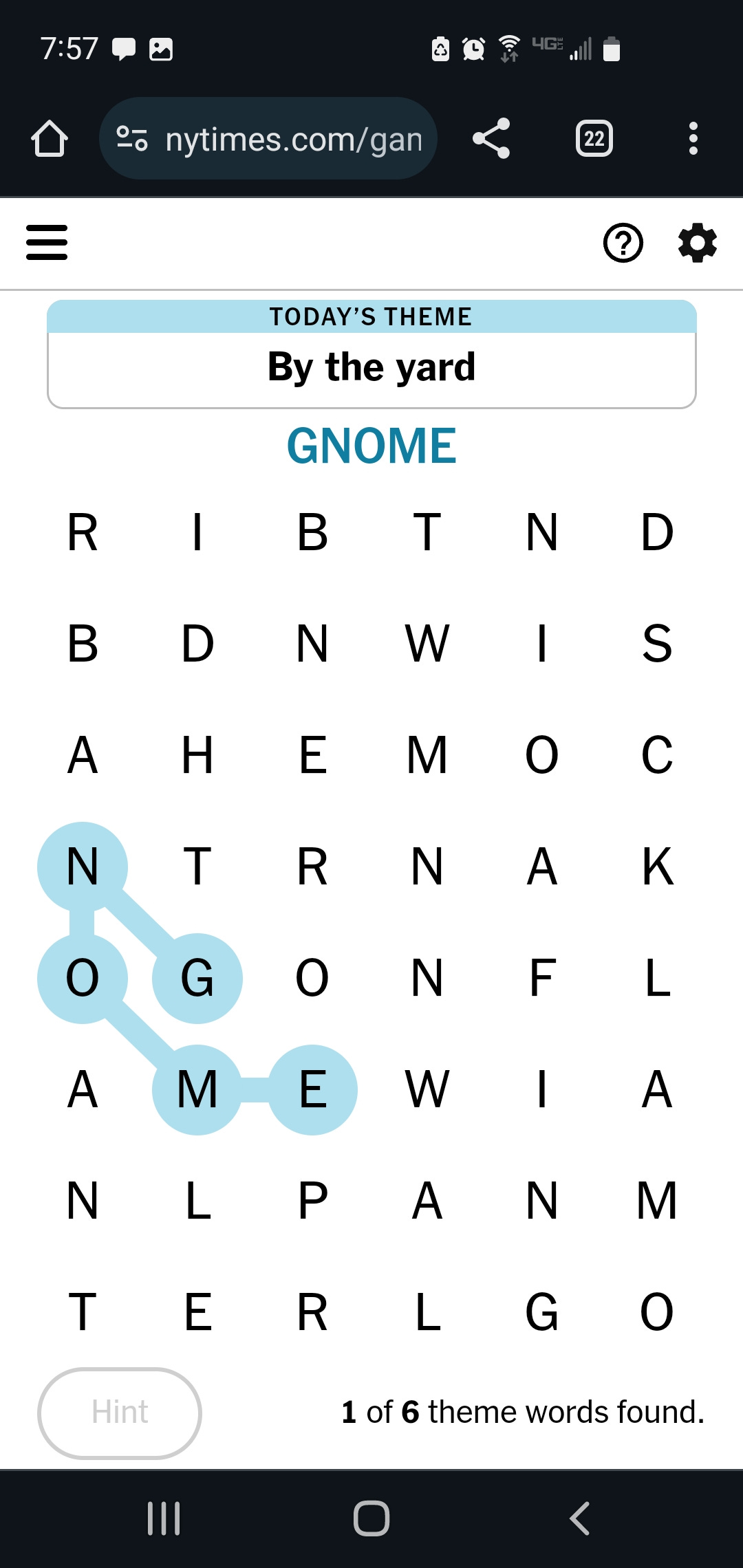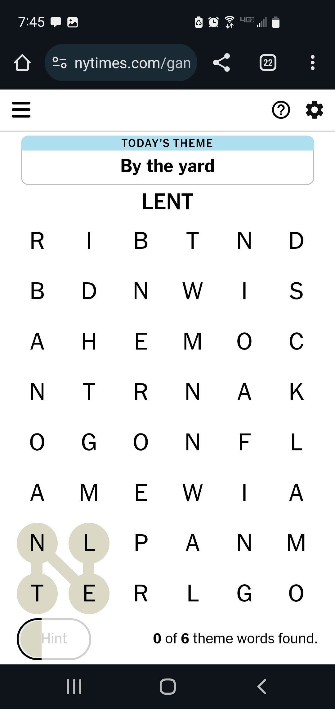 Now, LENT is not one of the words that I’m meant to find, but I don’t have to worry about that. There’s no penalty for guessing a word that’s not meant to be in the grid, and in fact, there’s a slight reward: every time you find three words that aren’t in the answers but are in the Strands dictionary, you get entitled to a hint. Looking around the grid, I soon find two more: DISC in the upper right and GONNA near the middle.