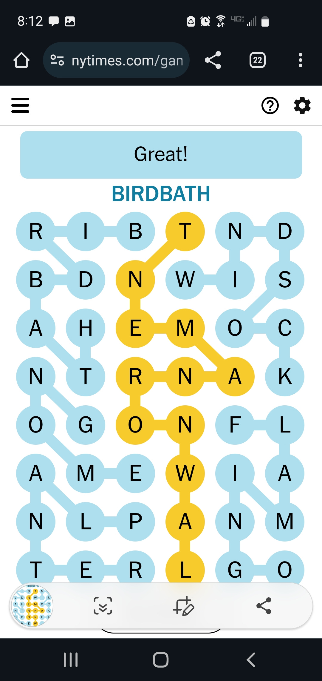 Then the puzzle gives me results (“Great!”) that indicate where I used my hints and when I found the spangram.