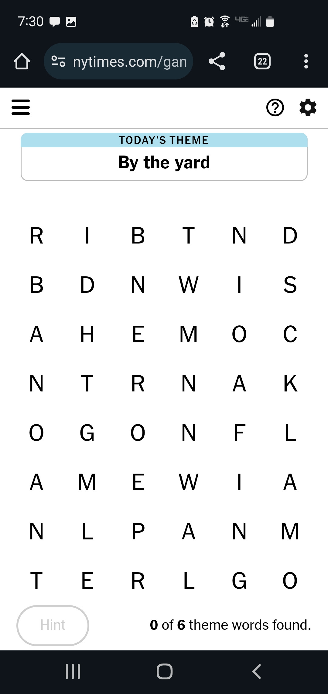 I can’t think of what the theme is yet, so I’m just going to noodle through the grid and see what words I can find out of it.