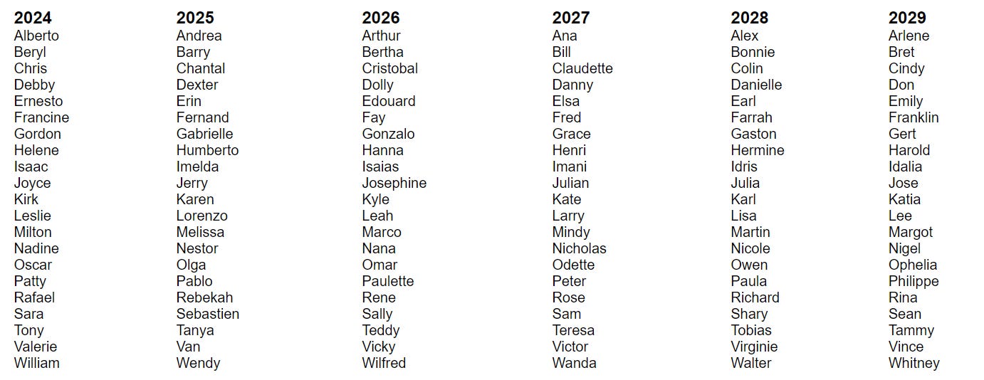 You’ll notice there’s an attempt at gender parity here, with names alternating between male and female as you go down the list, and also as you go across from year to year. Debby is followed by Ernesto, then Francine, then Gordon, and the “D storms” from year to year are Debby, Dexter, Dolly, Danny, Danielle, and Don. A few names like “Sean” are gender-ambiguous. “Male” hurricane names didn’t join the official lists until 1979.