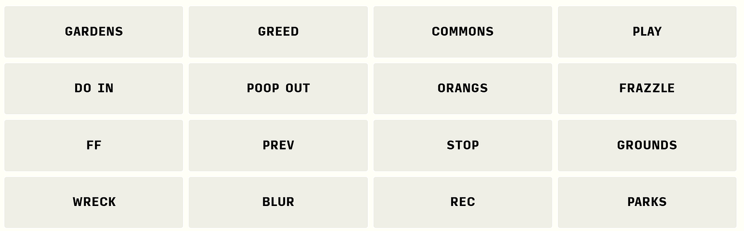 It’s time for another Connections puzzle! This one started out too hard, then became too easy, then developed an error that made it unsolvable, then became just right (I hope)!