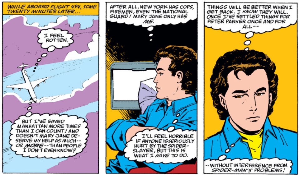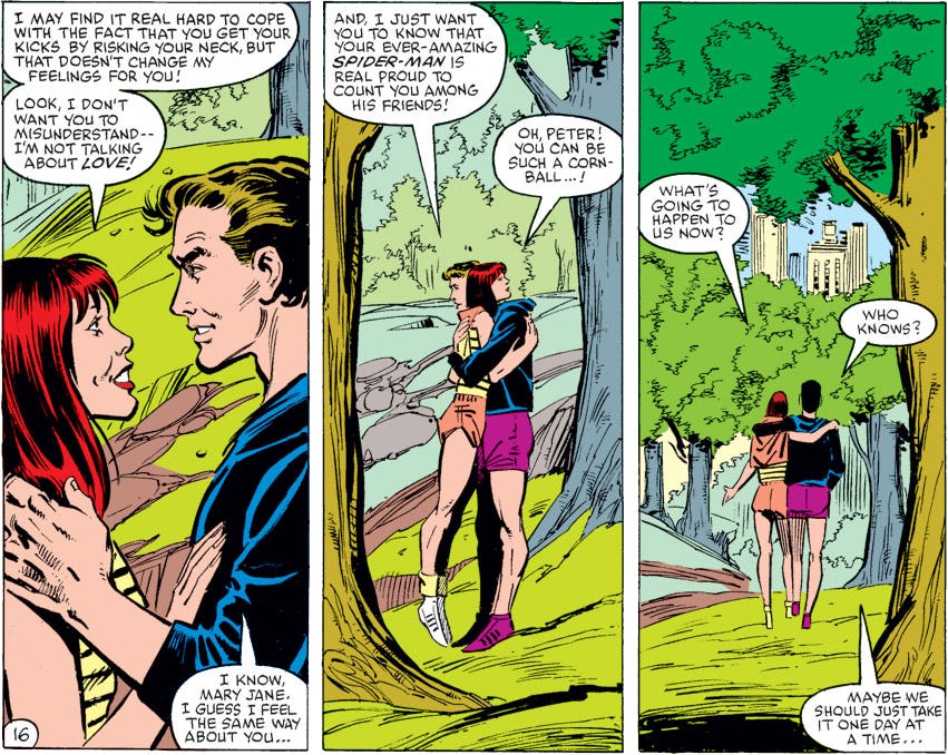Peter had spent his life chasing responsibility, sometimes to extremes. After they had a heart-to-heart, MJ shifted from saying she “couldn’t cope” with Peter’s secret to saying she found it “hard to cope” (#259, below). Maybe they could balance each other out?