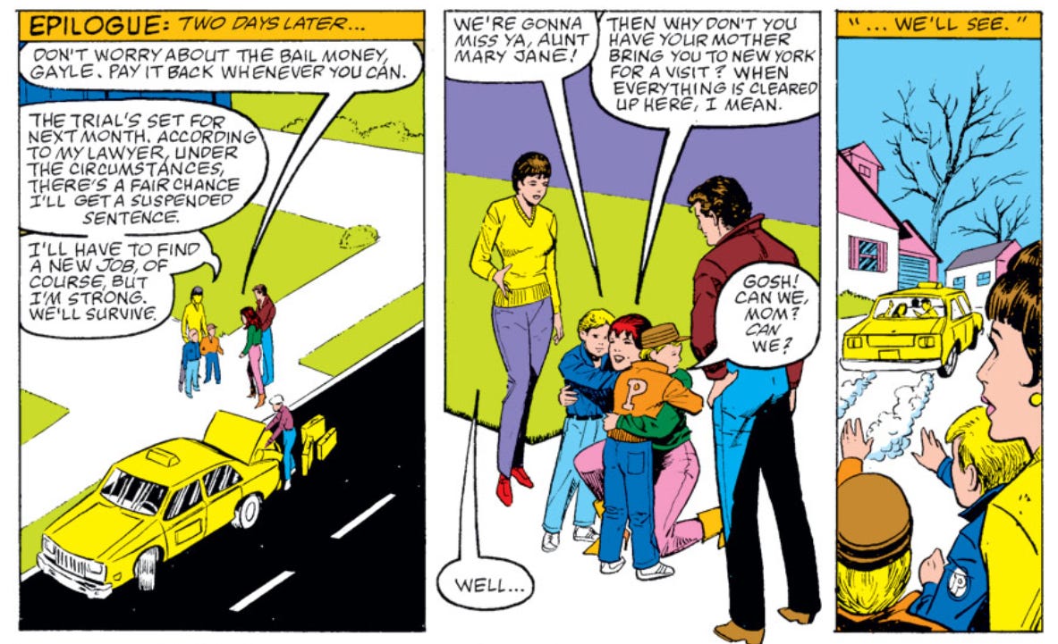 To the creators’ credit, they recognized that Mary Jane had to work out her own issues before she could upgrade all the way to “Yes, I can cope” with Peter’s secret. The result was one of the best MJ stories ever, in which she had a reckoning with her family—she reconnected with her sister Gayle and Gayle’s two kids, and she cut ties with her awful, crooked father (Amazing Spider-Man #292).