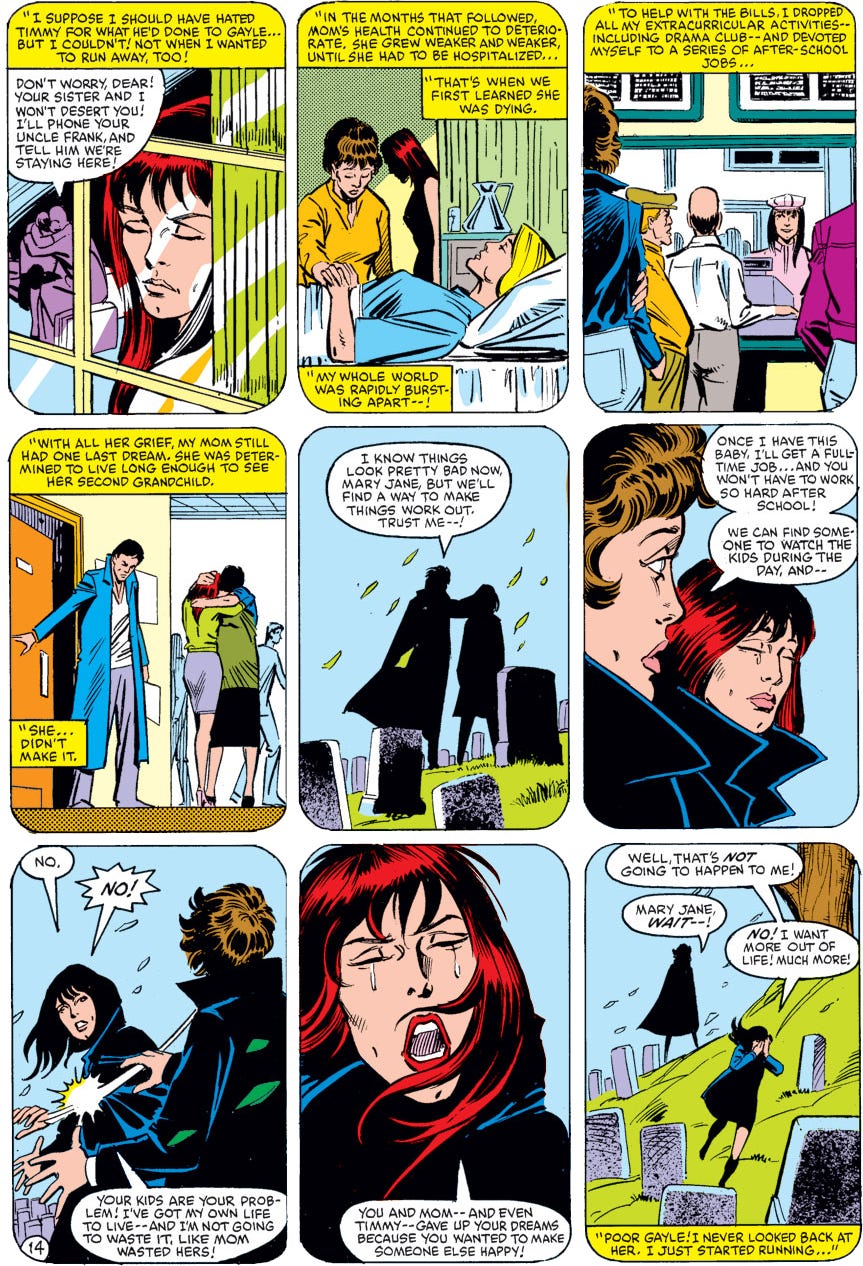 Mary Jane’s family drama was a deeper backstory than superhero-comic supporting characters had tended to get up to this point. It wouldn’t explode into the canon from there—the Spider-comics tend to feature Gayle about once per decade. But it clarified some key issues for MJ.