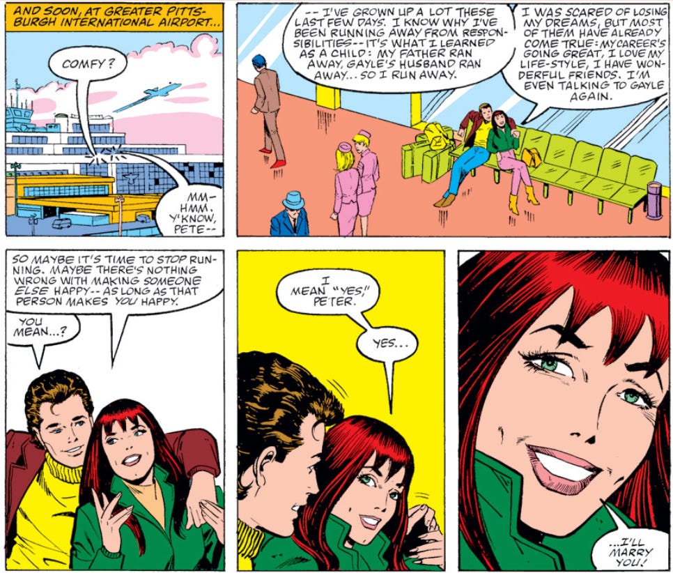Peter, for his part, made the tough choice to be there for her even when there was a supervillain on the loose. It was the first time he’d prioritized her over the duties of his costumed identity (#291)—