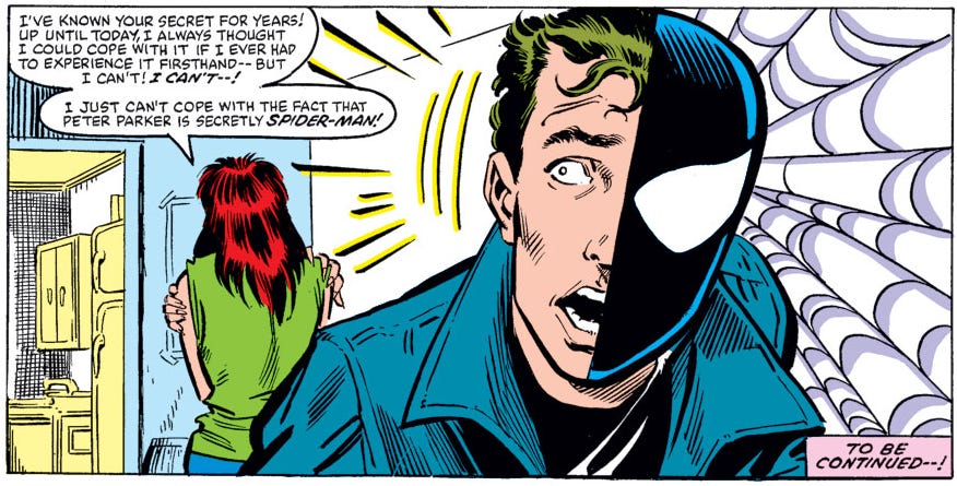 “I just can’t cope with the fact that Peter Parker is secretly Spider-Man” (#257).