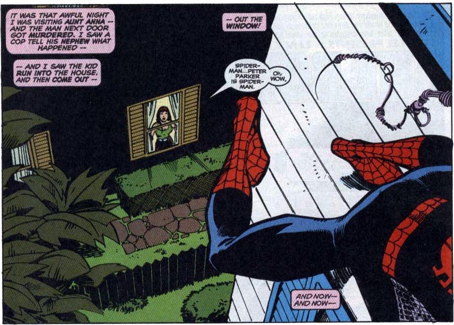 In unmasking Peter, she unmasked herself. She hadn’t just figured it out, she’d known for ages. We later learned how—as a teen visiting her Aunt Anna, she’d seen him in costume, crawling out of the Parker home (first in Amazing-Spider Man: Parallel Lives, reworked in Untold Tales of Spider-Man #16, below).
