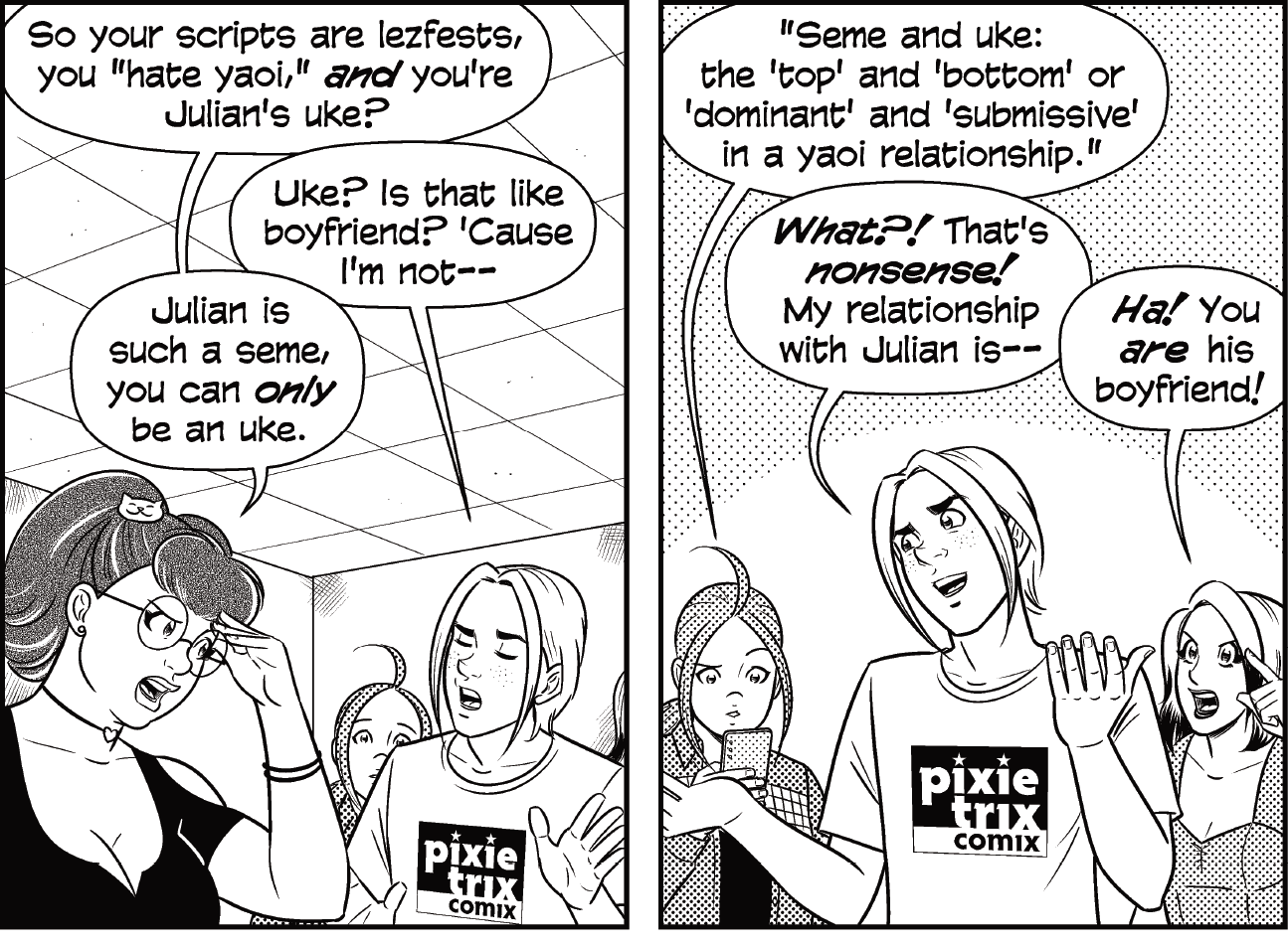 The terms seme and uke come from the robust genre of gay romance, AKA yaoi, in manga, but don’t feel bad if you don’t know ’em. Even most of the characters in Pixie Trix have to Google what they mean: