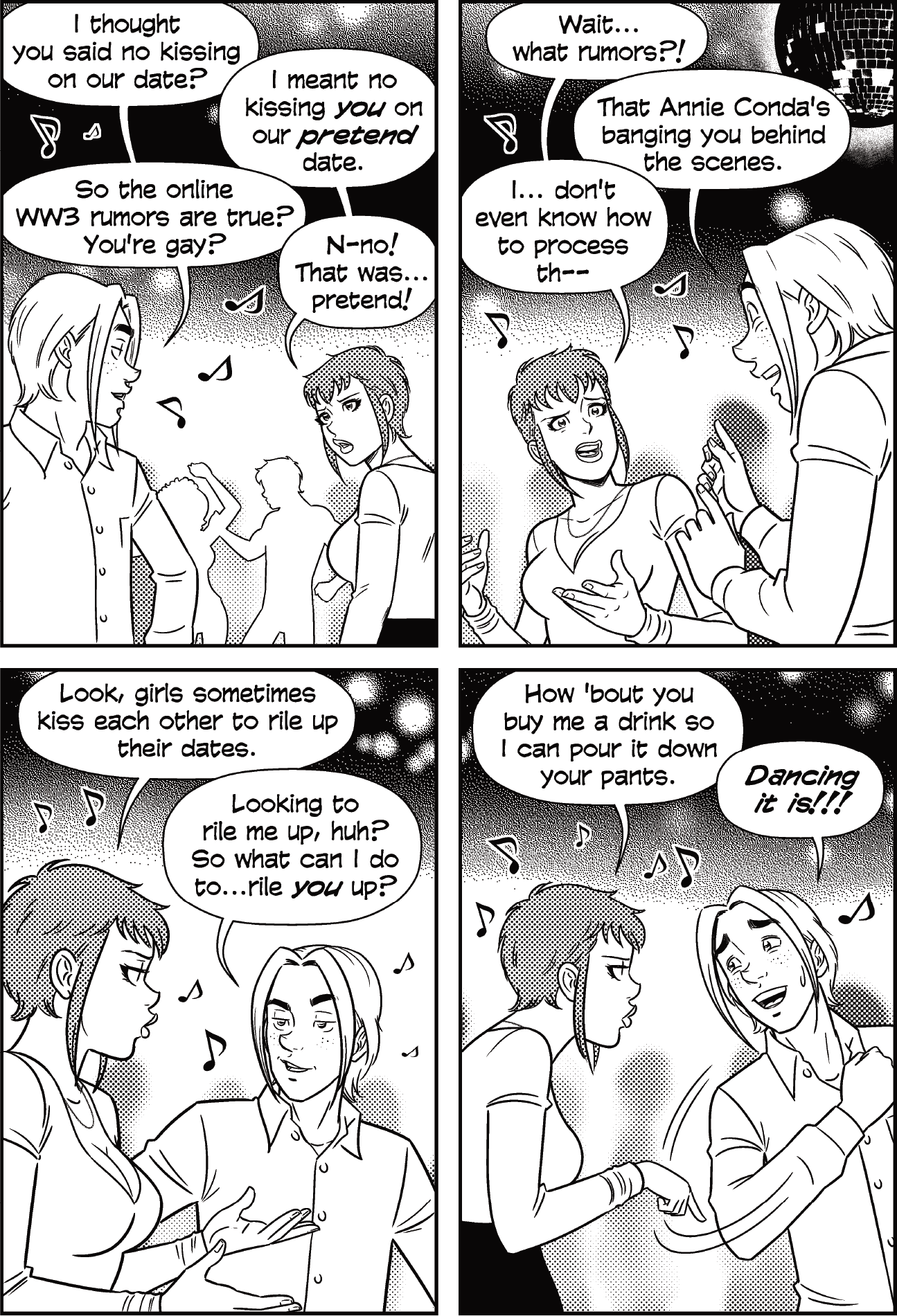 The simplest titles usually take the most time to come up with—of the five chapter titles in this volume, this was the toughest nut to crack. In comic books, the “cover date” is the publication date put on the cover (which sometimes diverges from the comic’s actual release date). In this romantic comedy, as you might expect, it’s got more to do with the romantic kind of date, a staged “cover” for Aaron’s basically-single status.