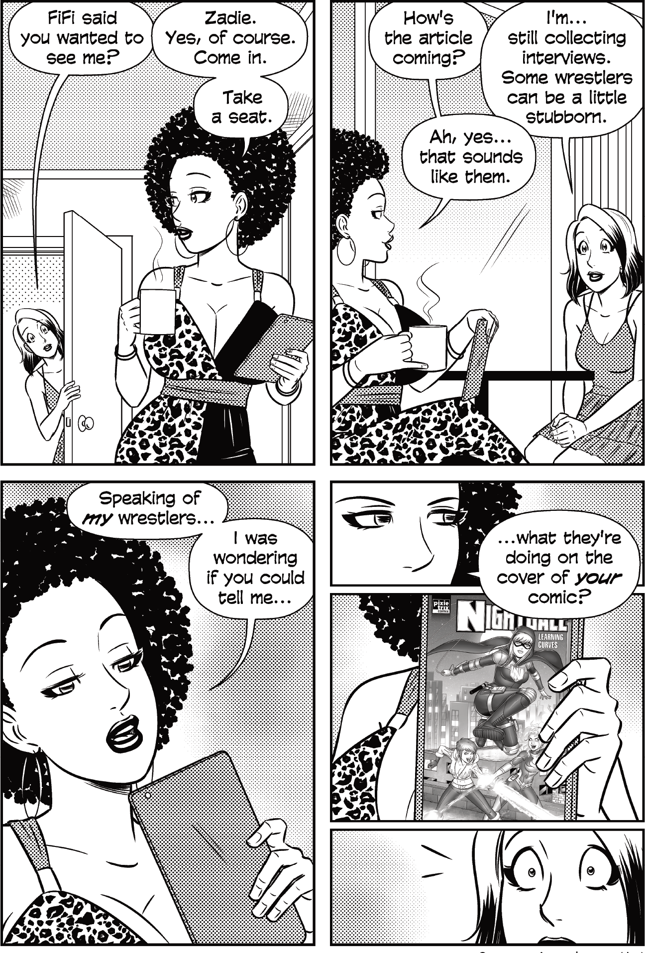 Finally, “The Big Two” is the name comics fans use for DC and Marvel, which have owned most of the comics market for most of the last half-century. Here, it also refers to tycoon GiGi and her trusted assistant FiFi, who run a billion-dollar wrestling brand and have nefarious plans involving Pixie Trix employees. These begin when they offer editor Zadie a freelance gig that seems too good to be true—and is.