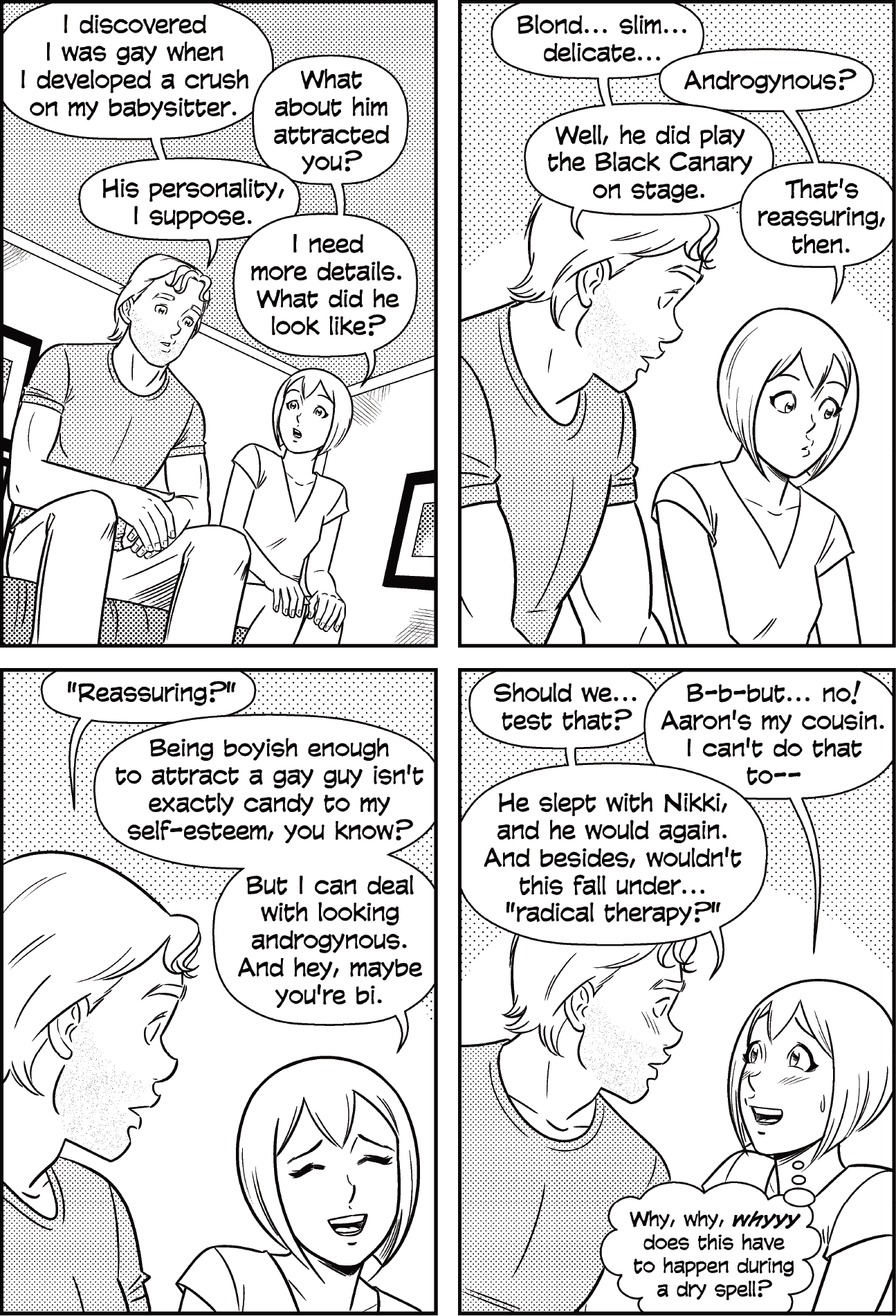 In the next installment, the confused and “macho” Aaron befriends another guy, straining his relationship with Julian even further and kicking off a tense video gaming session. The title for this one won’t mean much to manga fans, but it might mean something to webcomics fans…