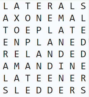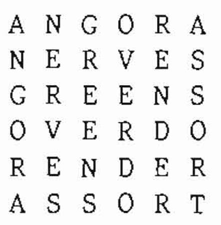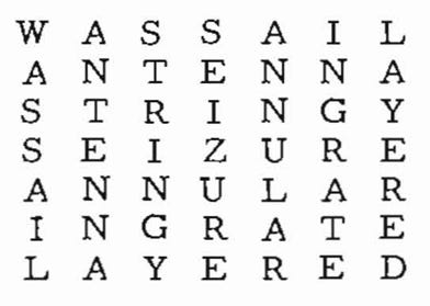 3x3 word squares are easy to make, a fine exercise for a beginning crossword constructor. 4x4 and 5x5 aren’t too hard either, but after that, things have gotten interesting. Each new level has represented a challenge for the word researcher. Here’s a 6x6 I like from Word Ways (Dmitri Borgmann, 1987):