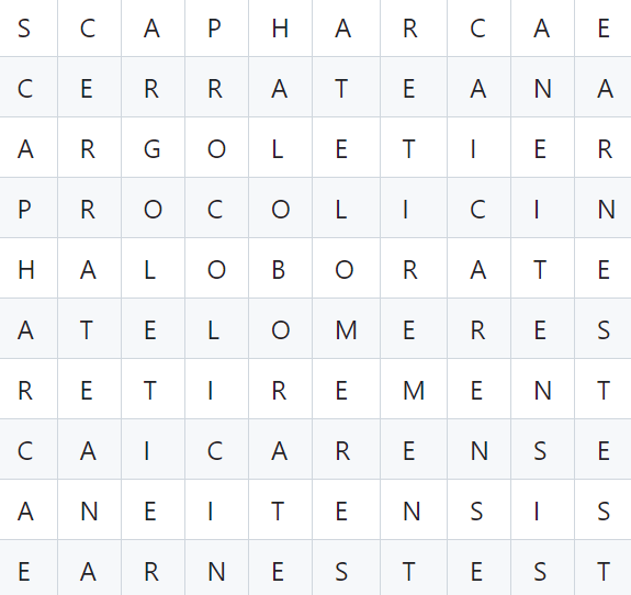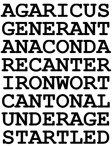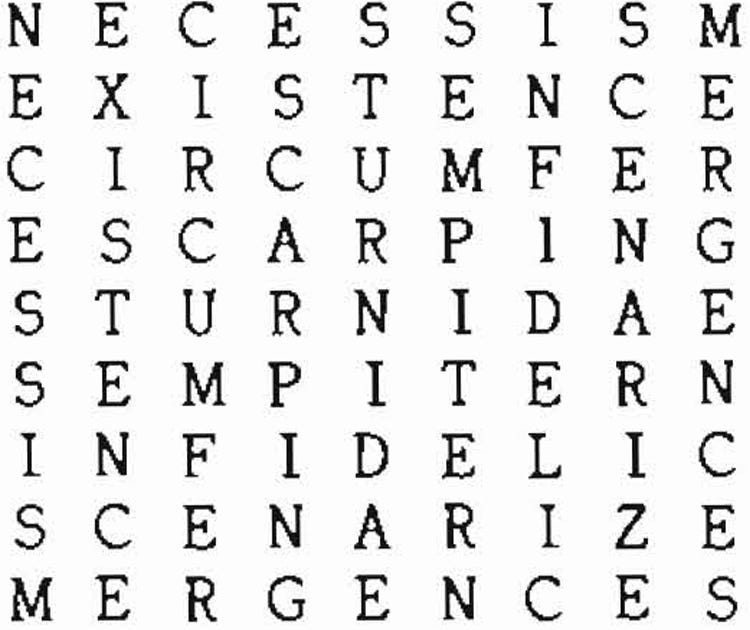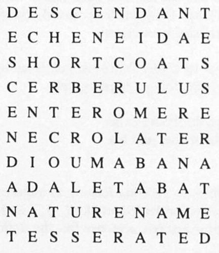 The 8x8 square seems to represent a great leap forward in difficulty. I haven’t found one yet where all eight words seemed familiar to me. One of the most accessible is found in the Wikipedia entry on word squares: