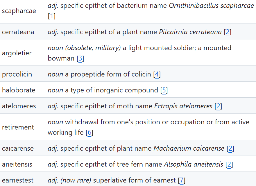 These words are pulled from seven different sources. Of the ten, only one could be called common—retirement—with another one, earnestest, an unfamiliar form of a familiar word. But all ten have definitions and all ten are lower-case and unhyphenated, which is more than anyone else has been able to achieve in nearly two centuries of trying!