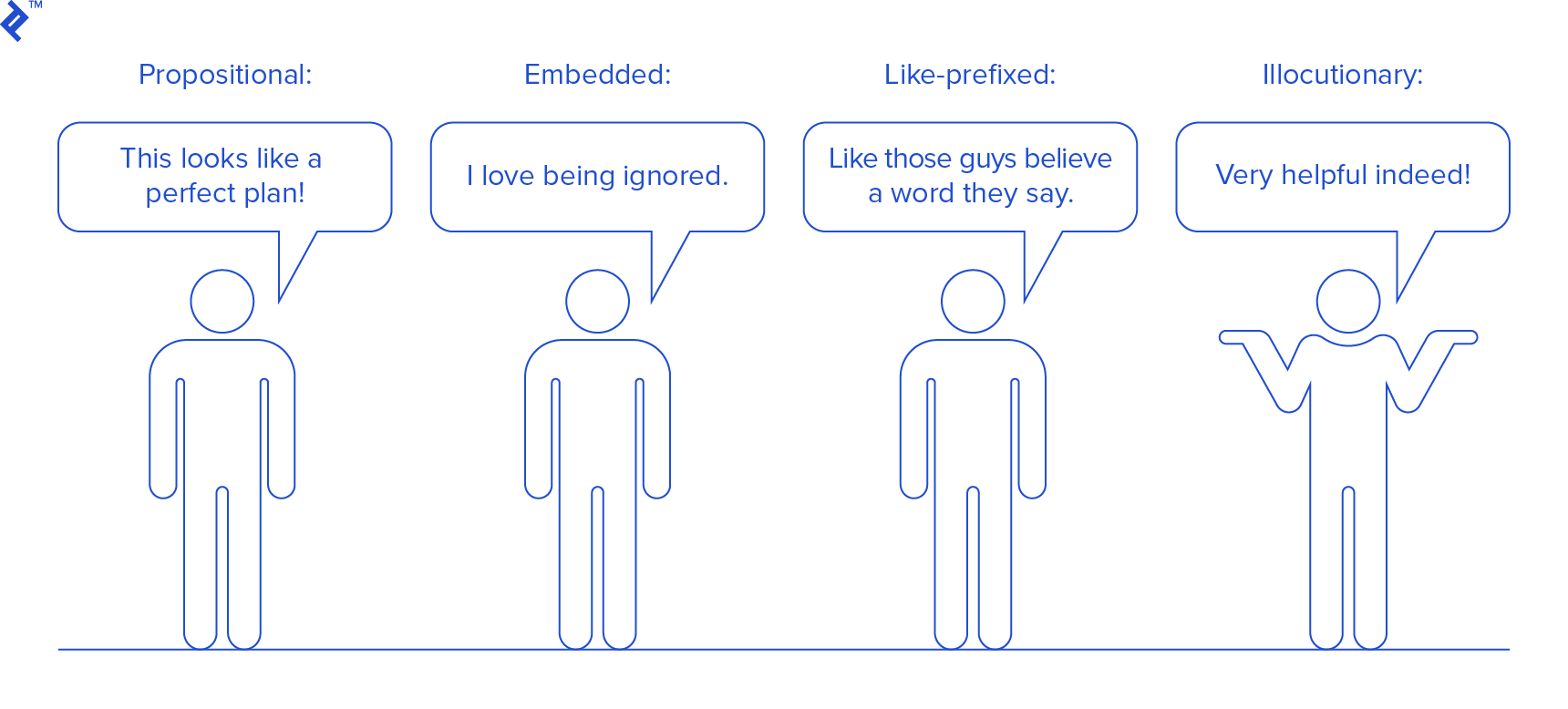 Similar problems come in when parsing sarcasmâwhich is difficult even for humans. Elisabeth Camp proposes four major types of sarcasm: propositional (no explicit sentiment but an implicit one), embedded (an incongruity between two sentiments), like-prefixed (using the word âlikeâ at the beginning of a phrase to imply denial) and illocutionary (body language, gestures, and other visual elements communicating sarcasm that might otherwise be unclear).