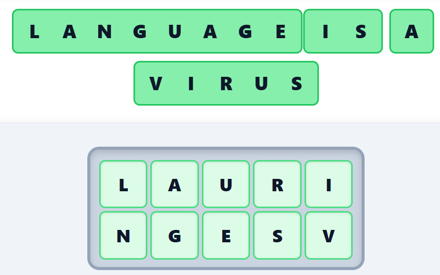 LANGUAGE has two A’s and two G’s, but this design only needs one of each. Trace the path (across, up, down, diagonally) and you’ll see you can spell out L-A-N-G-U-A-G-E. The other words are easier to arrange, but the U has to be in a spot where it can be part of V-I-R-U-S, and I and S need to be together too for this to work. Including A is a no-brainer, as it’s already part of LANGUAGE, but it’s still satisfying to see every word in the quote light up green.